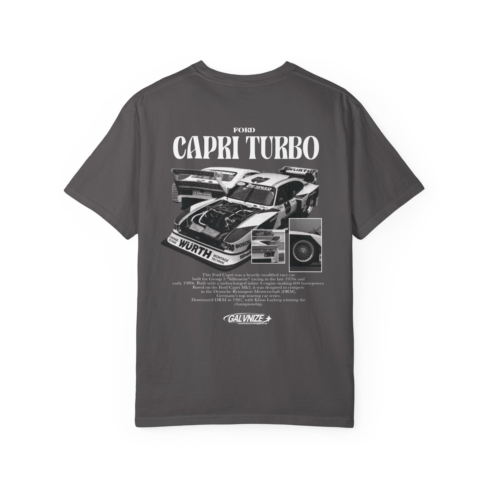 This GROUP 5 FORD CAPRI T-shirt exudes a vintage and retro vibe perfect for car enthusiasts and racing fans.